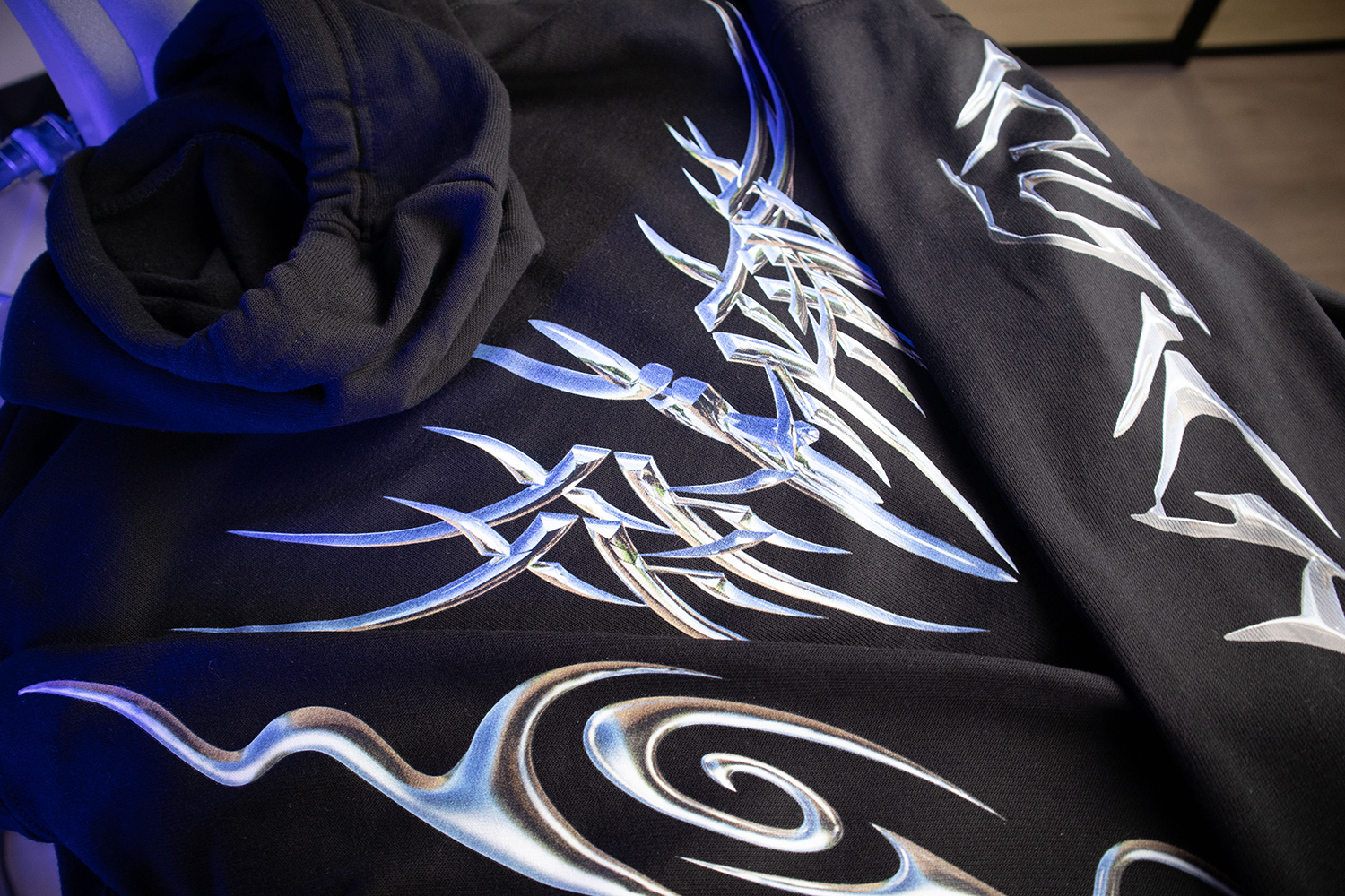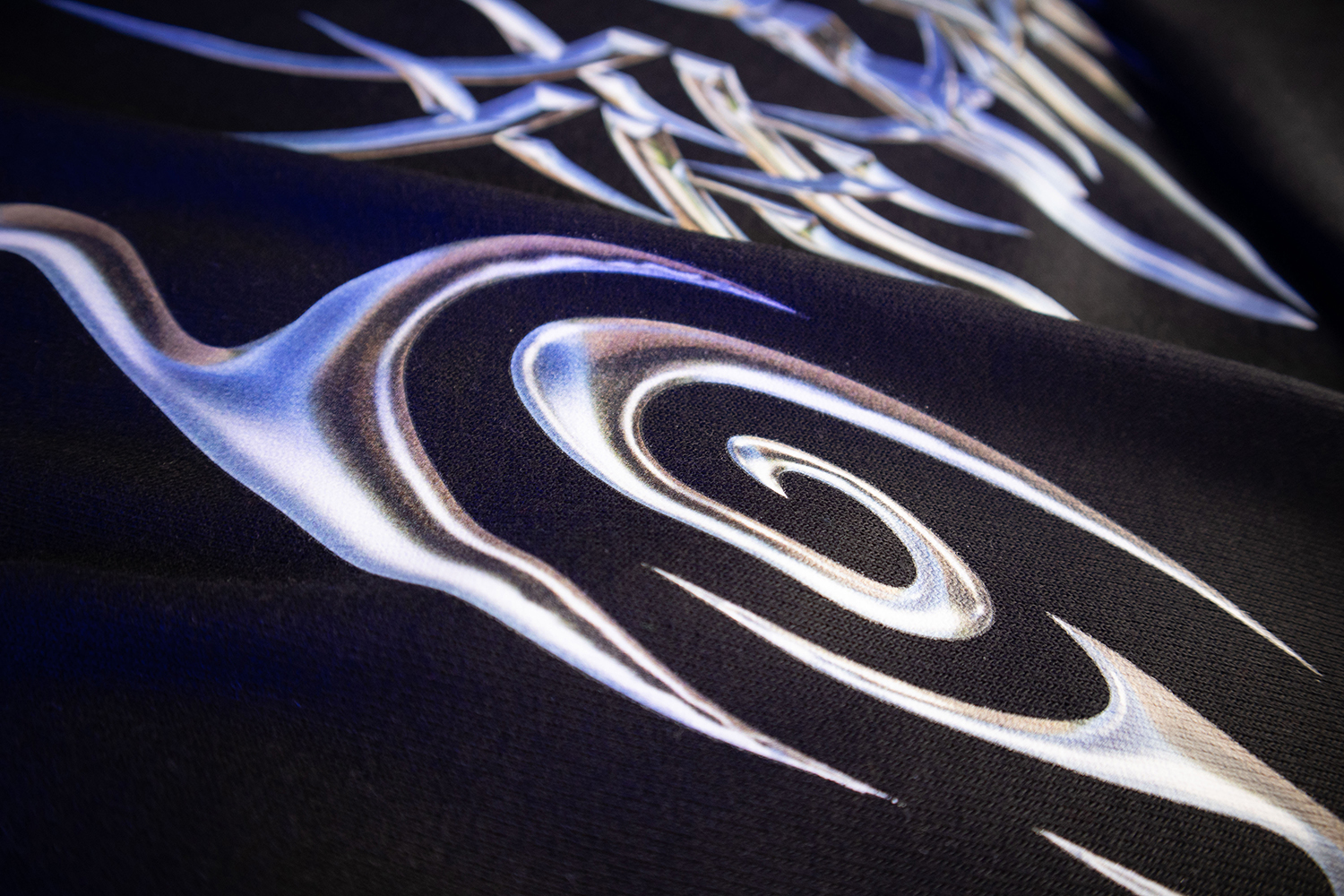 This design offers a realistic reflective and metallic finish. The shadows within the design hold a blue hue to them so we have complimented this by displaying the garments nearby a blue light / blue background helping the designs appear even more lifelike.