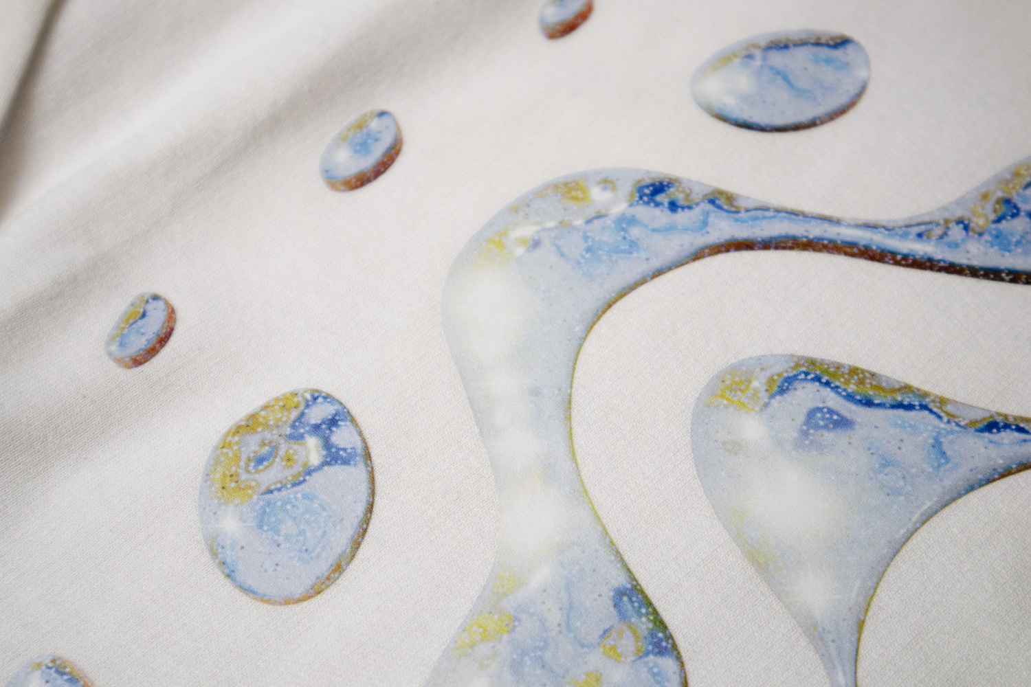 Again we have followed the liquid theme here. The shadows and highlights within this graphic offer a metallic liquid look where the graphic appears to sit atop the garment like water.