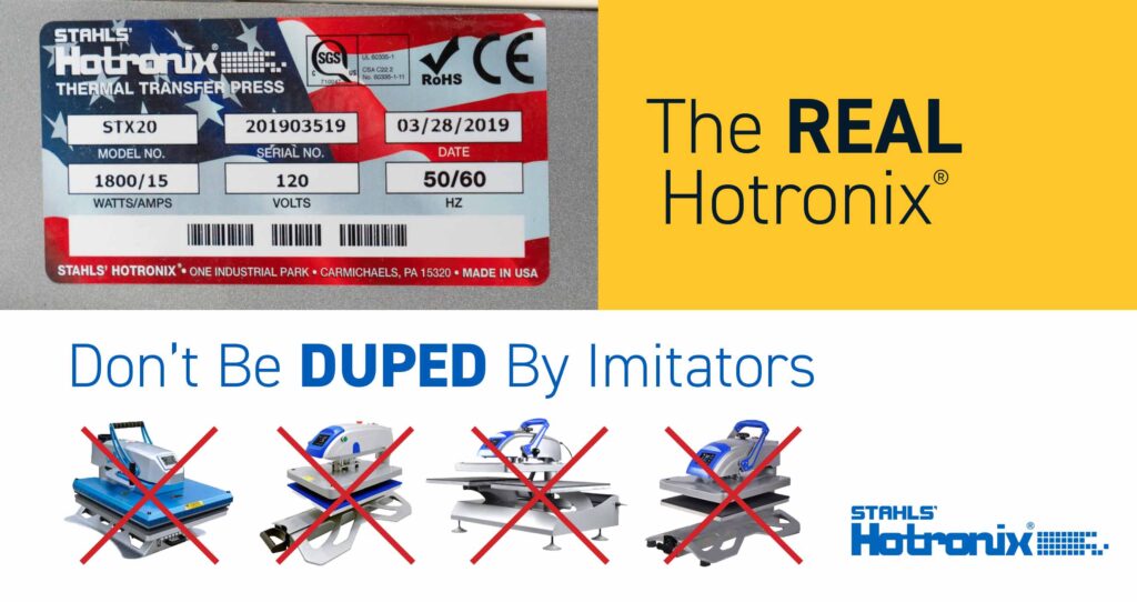 Don’t settle for a replica heat press, get the real thing! When you’re shopping for equipment, watch out for imitation presses that fake the appearance of Hotronix® to dupe you into thinking you’re making a good purchase. Look for the STAHLS’ Hotronix® branding directly on the metal or certified Made in USA serial tag!