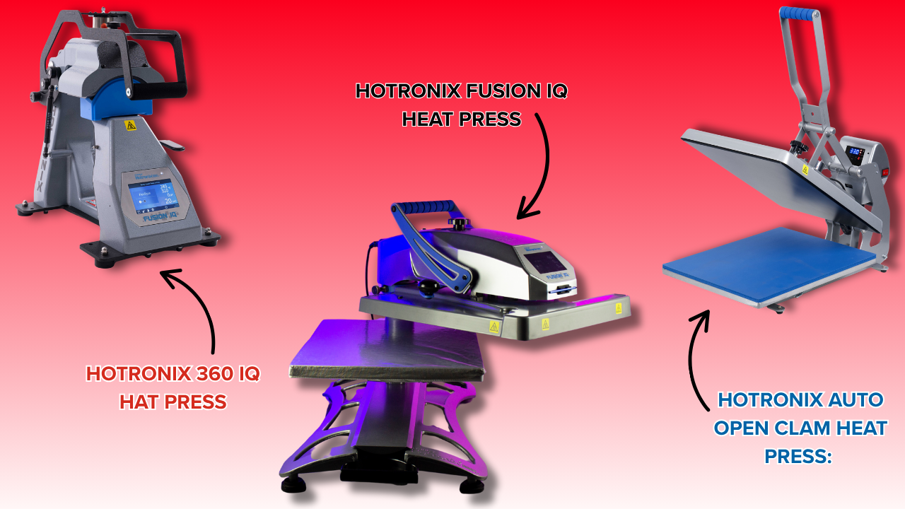 - Hotronix Fusion IQ Heat Press: a feature-rich press with touchscreen controls and smart technology, perfect if you want a machine that can grow with your business