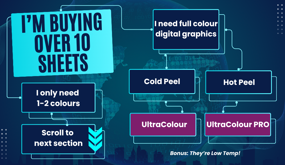 Choose UltraColour for a cold peel and UltraColour Pro for a hot peel. Bonus: Both transfer choices are low temperature and perfect for heat sensitive fabrics!