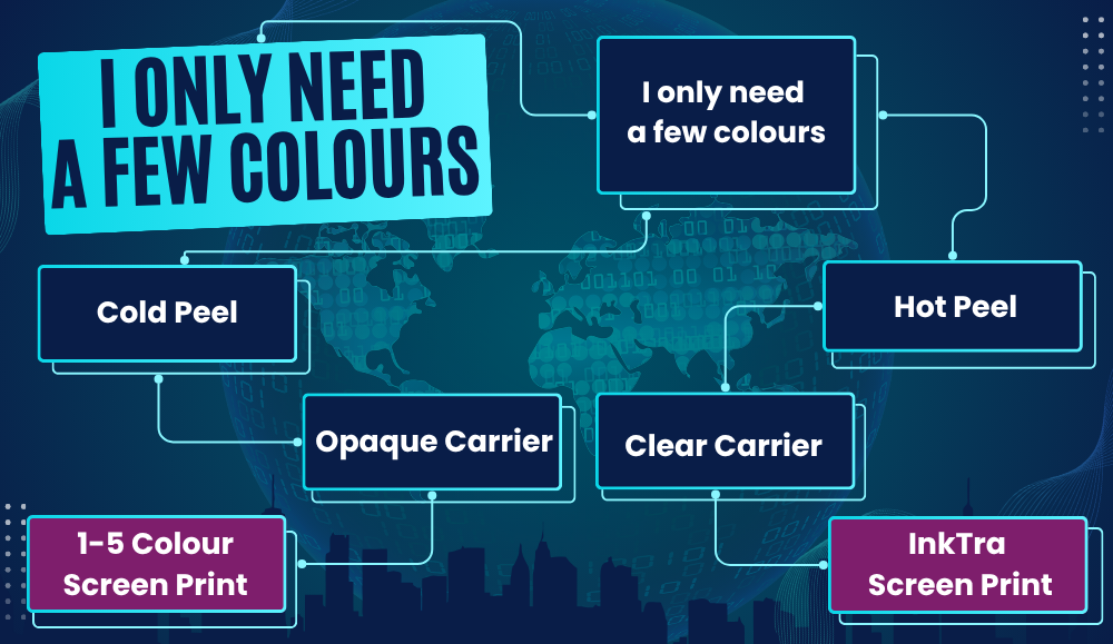 Choose InkTra for a hot peel and a clear carrier. Choose 1-5 Colour Screen Print for a cold peel and an opaque carrier.
