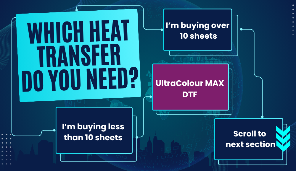 To help you find the right heat transfer for each job, we've created a handy quiz. Find which heat transfer is right for the order you're placing based on the number of colours in the design & the quantity you need